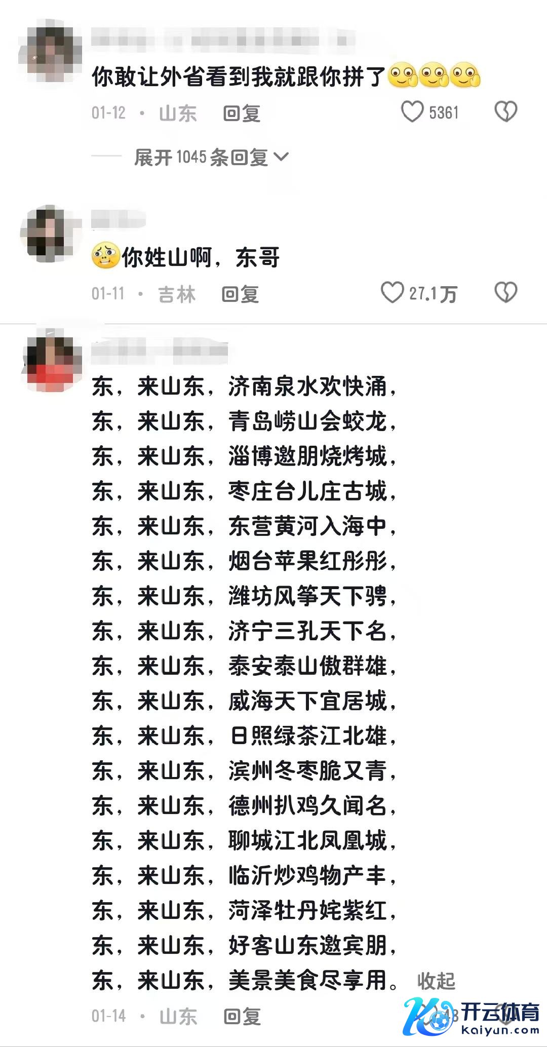 这几句简便却超上面的词儿,配上带感的节律,几句话,琅琅上口。驳斥区更是吵杂超卓,“听一遍就被洗脑,这才是山东专属 BGM”“这首歌传到那儿了”,还有网友现场为山东作曲,可见这股喊麦风刮得有多猛。山东的宥恕好客就这样随着节律,钻进了人人心里。