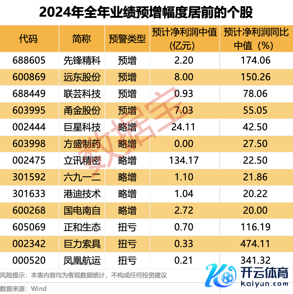 从事迹预喜的公司来看,立讯精密、神火股份、巨星科技、九丰动力的预报净利润中值居前,均超10亿元。立讯精密预测公司事迹略增,2024年净利润约131.43亿元~136.91亿元,较旧年同期净利润变化约为20%~25%。