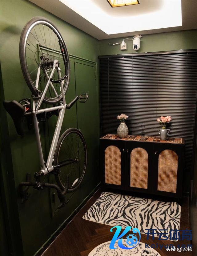 而就连傍边的成立间,也被刷成了绿色门,傍边再作念一个挂置自行车的墙面挂架。