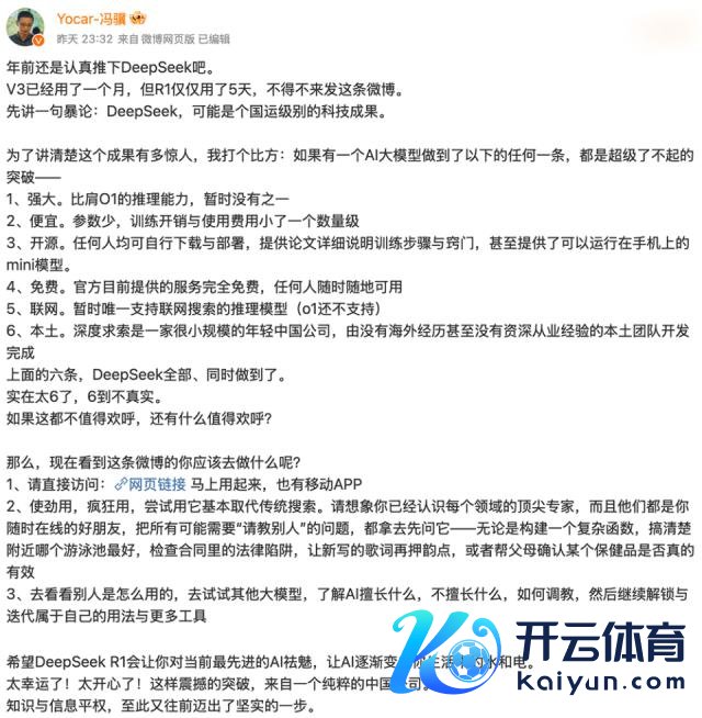 《黑神话:悟空》制作主谈主冯骥终点发了篇小作文,盛赞 DeepSeek "可能是个国运级别的科技效果"、"会让你对现时起首进的 AI 祛魅",让常识和信息平权"又往前迈出了坚实的一步"。