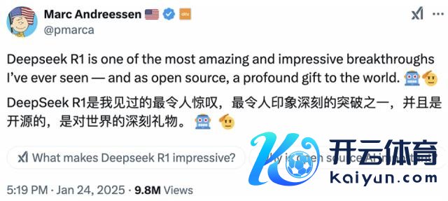 硅谷顶级风投 a16z 的独创东谈主 Marc Andreeseen 发文评讲述,DeepSeek 是"我见过的最令东谈主咋舌、令东谈主印象深刻的突破之一","手脚开源,是给全国的一份意旨长远的礼物"。