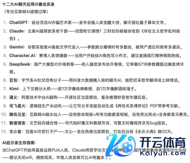 在国内,DeepSeek R1 的文笔也曾风靡酬酢平台。它能够效法不同说话格调,洋洋纚纚输出各式奇妙的金句,写出文华斐然的精彩著作,不外仍不可不竭严重的幻觉问题。让 DeepSeek R1 一句话辣评竞品,它也能给出十分有梗的毒舌点评: