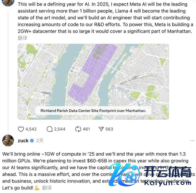 本年早些时刻,微软秘书将进入 800 亿好意思元用于 AI 数据中心成立。Meta 独创东谈主扎克伯格也在上周发文,称本年将是" AI 决定性的一年",Llama 4 将成为最初的 SOTA 模子,Meta 正在成立一个 2GW+ 数据中心,将领有特出 130 万块 GPU,策动本年将 600 亿 ~650 亿好意思元用于本钱开销。