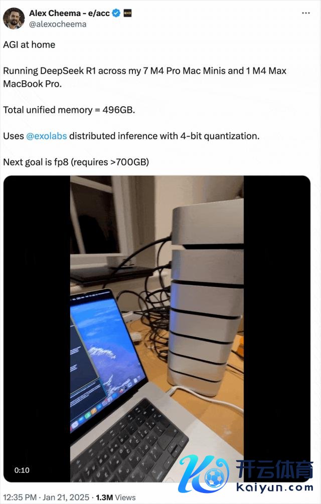 来自 AI 实验室 EXO Labs 的 Alex Cheema 共享说,他把 7 台 M4 Pro Mac mini 和一台 M4 Max MacBook Pro 连结来开动 DeepSeek R1,总内存 496GB,诓骗 EXO Labs 的漫衍式推理和 4bit 量化来终了"在家 AGI "。