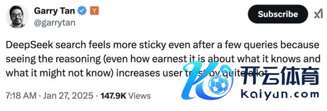 Y Combinator 首席实行官 Garry Tan 当天发文共享他的使用体验:"经过几次查询后,DeepSeek 搜索嗅觉愈加可靠,因为看到推理经过(乃至它对我方知谈什么和可能不知谈什么有何等厚爱)会大大加多用户的信任。"