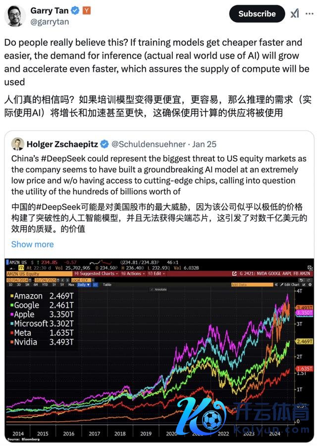 记者 Holger Zschaepitz 评价 DeepSeek 可能是对好意思国股市的最大羁系,因为该模子引发了对数千亿好意思元本钱开销的效率的质疑。Garry Tan 则合计 DeepSeek 的班师对好意思国竞争敌手有克己:"若是覆按模子变得更低廉、更快、更容易,那么对推理(践诺使用 AI)的需求将增长和加快得更快,这确保了筹备的供应将被使用。"