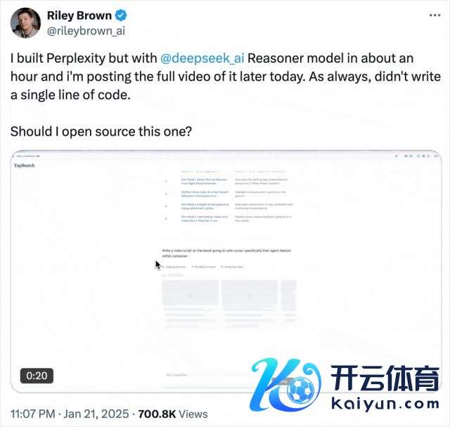 AI 社区的活力被握续引发。软件作曲家 Riley Brown 共享我方使用 DeepSeek 推理模子,在短短 1 小时内,创建了 AI 搜索引擎 Perplexity AI 的克隆版。他说我方没写一滑代码。